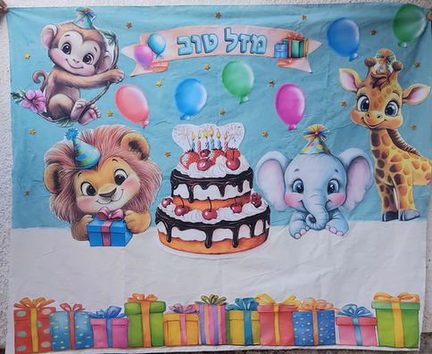 תפאורה ליום הולדת בגן ציור יד על בד כותנה עם צבעי אקריל מעוצבת עם הדמויות מקנווס, נצנצים וכל מיני קישוטים יפים. המידה הסטנדרטית היא 2מטרים על גובה 1.5 מטרים ,היא מתאימה ללוח של הגן ,אבל יש אפשרות גם מידה יותר קטנה של 1.5 מטרים רוחב על 1מטר גובה. התפאורה עוזרת לך ליצור אווירה של חגיגה ושמחה שתשאר בזיכרון של ההורים והילדים