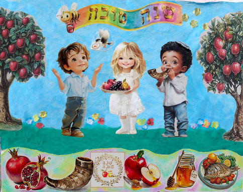 תפאורה ראש השנה. ציור יד על בד כותנה עם צבעי אקריל מעוצבת עם הדמויות מקנווס, נצנצים ,פרחים מבד וכל מיני קישוטים יפים. המידה הסטנדרטית היא 2מטרים על גובה 1.5 מטרים ,היא מתאימה ללוח של הגן ,אבל יש אפשרות גם מידה יותר קטנה של 1.5 מטרים רוחב על 1מטר גובה. התפאורה עוזרת לך ליצור אווירה של חגיגה ושמחה שתשאר בזיכרון של ההורים והילדים